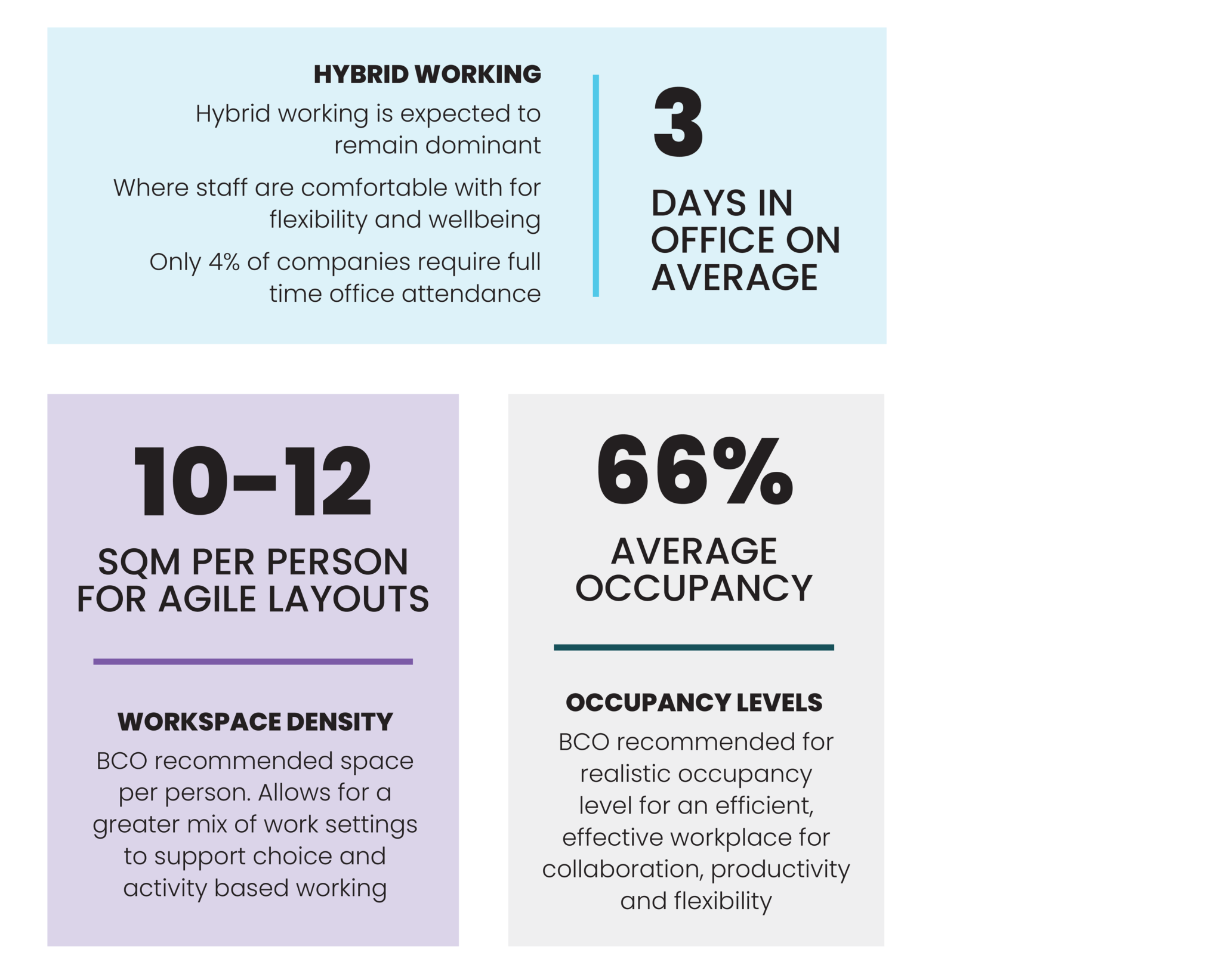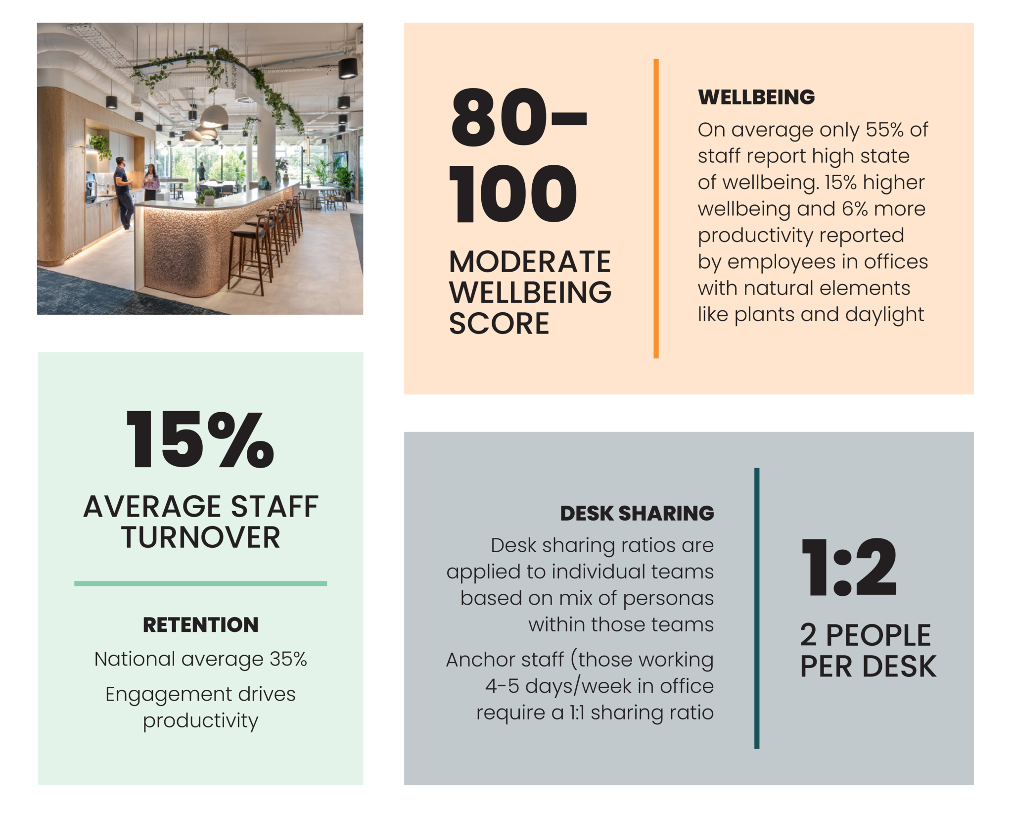 A confidential online staff survey allows us to understand how individual staff members feel about the office. Does it support or hinder their work? What would encourage them to be in the office more frequently? We can analyse the collective data at various levels, including by team and by location.